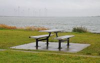 Picknick tafel bij nat weer in Zeeland met windmolens op de achtergrond.