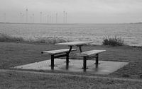 Picknick tafel bij grijs en nat weer , met windmolens op de achtergrond in zwart wit.