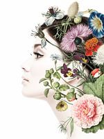 Het is een collage van een foto van een vrouw, met vintage afbeeldingen van veldboeketen.