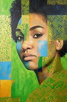 Een portret opgebouwd uit kleurrijke geometrische vlakken. Haar blik is rustig en zelfverzekerd, alsof elke kleur en vorm een stukje van haar verhaal onthult.