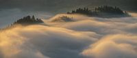 Mistpanorama in het Pieniny gebergte bij zonsopgang, Polen