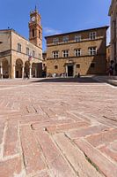Piazza Comunale met het stadhuis in Pienza in Val d'Orcia, Toscane, Italië.