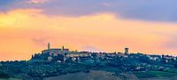 De stad Pienza, gezien vanaf Monticchiello tijdens zonsondergang van grote afstand gefotografeerd. Beiden stadjes liggen in midden Italië, in Toscane.