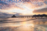 De pier in Heringsdorf bij zonsopgang. De kleurrijke wolken worden weerspiegeld in het natte zand.