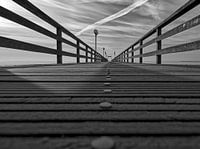 Houten pier bij Scharbeutz, Duitsland in de Oostzee, diep camerastandpunt met centraal perspectief