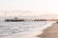 Foto van een pier in Lara, Turkije. Op de achtergrond is een bergrand te zien terwijl de ondergaande zon nog voor het laatst haar licht op de pier schijnt.