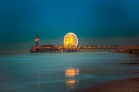Avond opname met lange sluitertijd van de Pier in Scheveningen op het strand