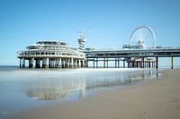 De pier van Scheveningen op een mooie zonnige dag. Deze foto is genomen met een lange sluitertijd. Dit kan je zien aan de "nevel" in de zee en het reuzenrad. Deze foto is ook in zwart wit beschikbaar.