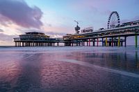 De Pier van Scheveningen tijdens zonsondergang. Door de lange sluitertijd is de beweging in de zee te zien.