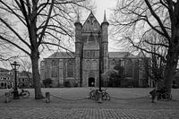 De geschiedenis van de Pieterkerk in Leiden, op dit werk frontaal vanaf de voorkant vastgelegd, gaat terug naar het jaar 1100. De kerk is vernoemd naar haar schutspatroon, de apostel Petrus aan wie de sleutel van het koninkrijk der hemelen werd gegeven. Het huidige gebouw dateert uit 1390. Dat Leiden de sleutelstad wordt genoemd heeft dus te maken met de naar Petrus vernoemde kerk. Dit werk is zowel in kleur als in zwartwit te bestellen.