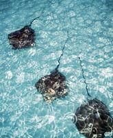 pijlstaartroggen in ondiep reflecterend water langs de kust in de Indische Oceaan op een tropisch eilandje in de Malediven. Door de reflectie op het water krijgt het beeld een bijna surrealistisch tintje