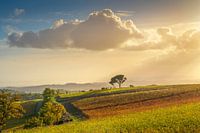 Stenen pijnbomen en wijngaarden, herfstlandschap in de Chianti bij zonsondergang.
