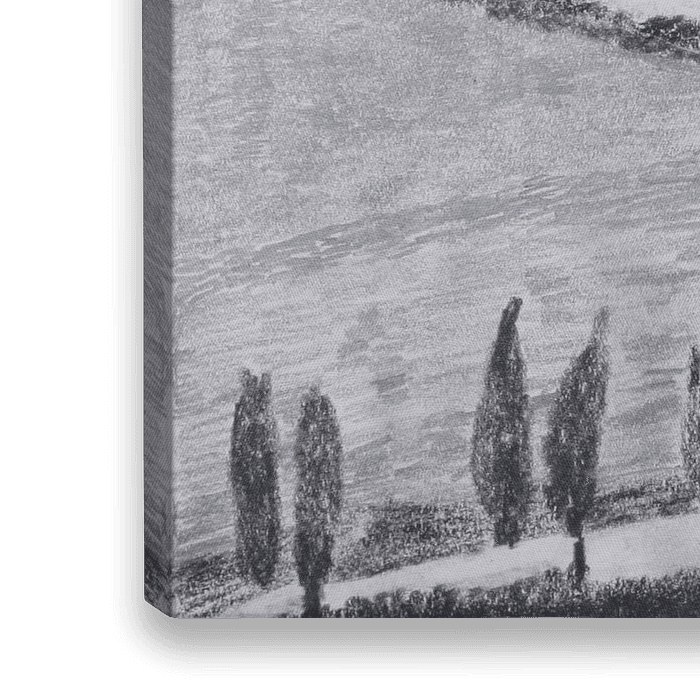 Tekening in houtskool en potlood voorstellende een slingerende weg omhoog door de heuvels van Toscane geflankeerd door Pijnbomen.