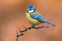 Pimpelmees (Cyanistes caeruleus) zittend op een dunne talk met scherpe stekels.