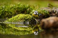 Pimpelmees aan de zijkant van het water met een mooie reflectie / spiegelbeeld in het water.