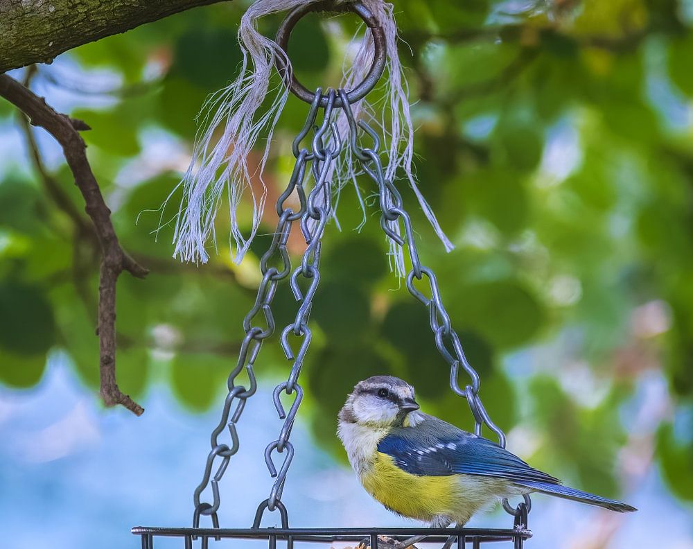 Pimpelmees bij het voederstation in een mand met meesknoedels