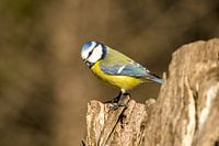 Klein maar pittig; de pimpelmees. De kleuren: blauw en wit op de kop, geel en groen op de buik en de vleugels. Maar vooral dat blauw, dat lichte blauw maakt van de pimpelmees een lichte vogel. Hier in vol ornaat.