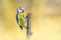 Pimpelmees op tak met op een mooie kleurrijke achtergrond.