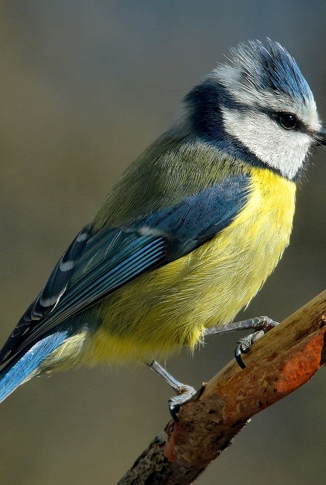 Een mannetje pimpelmees (Parua caeruleus) ruist zijn blauwe kopveren bij het baltsgedrag