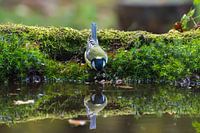 Dit pimpelmeesje zat naar zich zelf te kijken naar de mooie reflectie van het water, deze gemaakt in een vogelhut.
