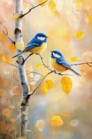 Dit fraaie realistische schilderij toont twee prachtig gedetailleerde pimpelmezen, die vredig op de takken van een berkenboom zitten. Hun verenkleed is levendig weergegeven met heldere blauwe en gele tinten, waarbij de subtiele penseelstreken de textuur van hun zachte veren benadrukken. De setting ademt een herfstsfeer, met prachtige geelkleurige bladeren die nog net aan de takken hangen. De achtergrond is dromerig en wazig, met warme aardetinten die een gevoel van rust en sereniteit uitstralen. De combinatie van de verfijnde details in de vogels en de impressionistische stijl van de omgeving maakt het geheel harmonieus en poëtisch.