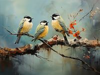 Dit pimpelmees schilderij is een levendige viering van de kleine gevederde schoonheid. Met gedetailleerde penseelstreken en levendige kleuren is de pimpelmees tot in de kleinste details tot leven gebracht. Zijn blauwe en gele verenpracht straalt tegen de achtergrond, en zijn heldere oogjes lijken je recht aan te kijken.