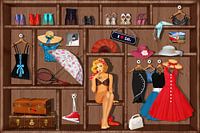 Sexy pin-up girl uit de jaren 60 in type geval doen met al de dingen die een vrouw gelukkig.