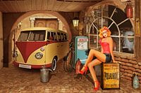 Sexy Pin Up Girl zittend op een bus in een nostalgische workshop met vintage auto Bulli T1 in retro stijl van de jaren '50 en '60.