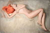 "Pin-up": Een verleidelijk schilderij van een roodharige pin-up, uitgevoerd in een klassieke boudoir pose. Het kunstwerk straalt een tijdloze sensualiteit uit, waarbij de naaktheid subtiel wordt weergegeven met behulp van strategisch geplaatste lichaamshoudingen en attributen.