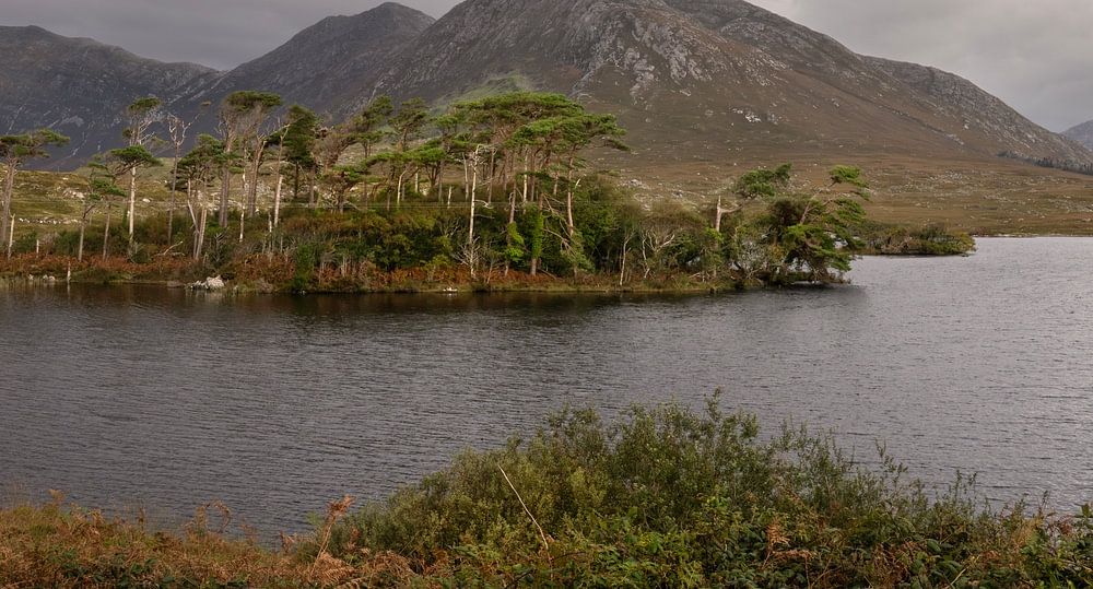 Een veel gefotografeerde plek in Connemara, Ierland is Pine Island in Derryclare Lough, met op de achtergrond de Twelve Bens.
