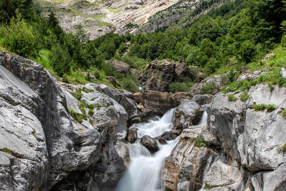 Waterval in de Pineta Vallei in de Spaanse Pyreneeën. Deel van het Nationaal Park Ordesa. Foto met een lange sluitertijd waardoor de beweging van het water mooi wordt weergegeven.