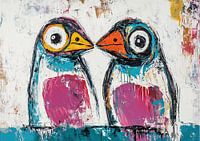 Pinguïn | Kleurrijke Pinguïns - Op dit dieren schilderij zie je twee kleurrijke penguins met opvallende grote ogen en een speelse kleurcombinatie van blauw, paars en oranje die samenkomen in een vrolijke en moderne stijl.