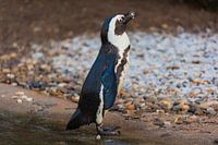 Deze pinguïn heeft net een duik in het ijskoude water genomen en geniet nu van de warmte van de zon.
