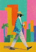 Dit gouache-schilderij toont een pinguïn in een pak en hoed, die een cocktail vasthoudt en door de straten van Miami loopt. Het tafereel is in pastelkleuren en geeft een vrolijke, heldere indruk. De achtergrond toont de skyline van Miami in vlakke, strakke vormen, terwijl de stijl doet denken aan de illustratie van Tom Finch en een…
