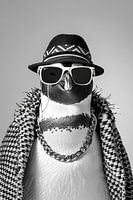 Een portret van een pinguïn in stijlvolle kleding, met hoed en zonnebril, zwart-wit afbeelding, voor modieuze en creatieve concepten.
