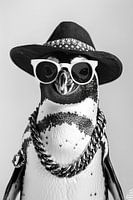 Een portret van een pinguïn in stijlvolle kleding, met hoed en zonnebril, zwart-wit afbeelding, voor modieuze en creatieve concepten.
