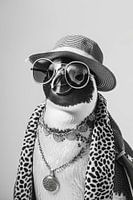 Een portret van een pinguïn in stijlvolle kleding, met hoed en zonnebril, zwart-wit afbeelding, voor modieuze en creatieve concepten.