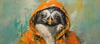Pinguïn - Dit levendige kunstwerk toont een pinguïn gehuld in een opvallende oranje jas tegen een achtergrond van zachte groen- en geeltonen. De stijl flirt met het abstracte en speelt met textuur, terwijl de pinguïn zelf charmant realistisch is weergegeven met een blik die de kijker recht aanspreekt.