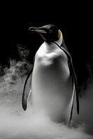 Een majestueuze pinguïn, stijlvol in zijn elegante zwart-witte uniform, rijst trots op uit een zee van mist. De mysterieuze sfeer geeft het geheel een bijna mystieke allure. Dit betoverende kunstwerk is een perfecte aanwinst voor een moderne woonkamer, waar het een gesprek en ontzag zal opwekken.