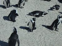Pinguïns bij Boulders beach. Eén kijkt lief in de camera terwijl de rest met zijn eigen ding bezig is.