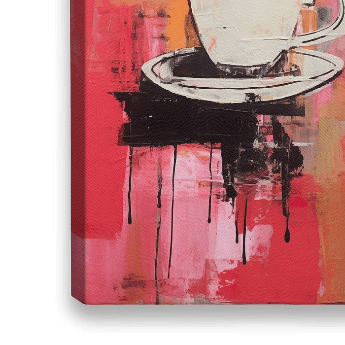 Deze expressieve werk vangt de essentie van een koffiepauze met een levendige achtergrond van rode en roze tinten, wat een gevoel van energie en passie uitstraalt. De gestileerde weergave van de koffiekop en schotel, uitgevoerd in dikke, zwarte en witte penseelstreken, staat sterk in contrast met de achtergrond en symboliseert een…