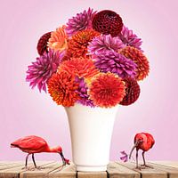 Prachtige roze tinten van verschillende Dahlia's in een witte vaas.