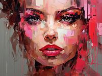 Een intens portret met roze accenten en sterke expressie. De kleur geeft het werk energie en emotionele kracht. Ideaal als statement piece.