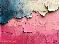 Het schilderij straalt textuur en beweging uit, met dikke lagen verf aangebracht met een paletmes in roze blauwe en witte tinten. De kleuren mengen grof en expressief, creëren diepte en ritme.
