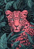 Een afbeelding van een roze luipaard in de jungle tussen verschillende groene bladeren, in de stijl van minimalistische achtergronden en onvoorspelbare animatie.