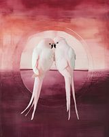 Pink Love ontvouwt zich als een teder, verstild universum waarin twee sierlijke vogels elkaar opzoeken in een intiem moment van herkenning. Hun lichamen buigen licht naar elkaar toe, alsof ze worden aangetrokken door een onzichtbare kracht — een stille belofte die niet uitgesproken hoeft te worden. Hun veren vangen het zachte roze licht…
