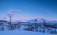 Kleurrijk, laatste licht op de bergen Nijak and Gisuris in nationaal park Sarek, de laatste echte wildernis van Europa. Lapland, Zweden.