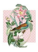 Een lief, zacht en teder portret van een vogel (en een vlindertje) in pastelkleuren.