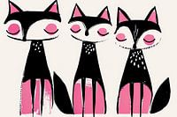 Pink Whiskers - Dit katten schilderij toont drie gestileerde zwarte katten met markante roze details tegen een eenvoudige witte achtergrond, geaccentueerd door subtiele, zwarte stippen en strepen.