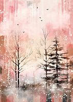 Een verstild winterlandschap, waarin de naaktheid van de bomen schril afsteekt tegen een zachte, roze getinte lucht. De bomen, met hun bladerloze takken, roepen een gevoel van kalmte en verstilling op. Sneeuwvlokken lijken te dwarrelen in de lucht, waardoor de scène een textuur van koude maar serene schoonheid krijgt. De silhouetten van…